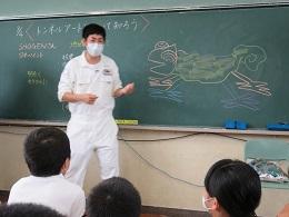 6年生は、SHOGENさんからアフリカで絵の勉強をしておいでた時のお話や、子どもたちが自信をもって描けるためのお話をしていただきました。6年生は、みんな目をキラキラにしてお話を聞いていました。