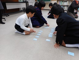 いよいよ昨日から各学年での百人一首大会が始まりました。冬休みの練習の成果を発揮して、上の句が詠まれ始めるやいなや、さっと札を取る速さにびっくりです。みんなそれぞれに頑張っていました。ご家庭でのご協力ありがとうございました。