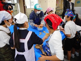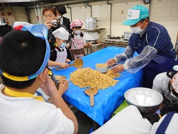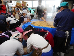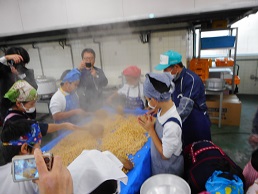 また、三年生は、育てた大豆を美味しい大海味噌にするために、一生懸命教えていただきながら作業に取り組みました。