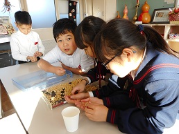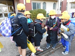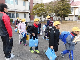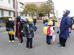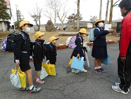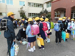 下校時の玄関前での話題は、楽しい冬休みの計画やクリスマスプレゼントで盛り上がっていました。運試しじゃんけんをする子たちや、「良いお年を」と互いに言っている子たちもいて、各班元気でにぎやかに帰りました。