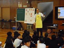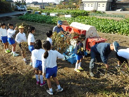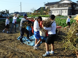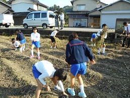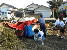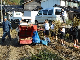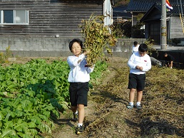 3年生は、大海味噌を作るための大豆の学習をしていますが、今日はいよいよ収穫し、脱穀作業のお手伝いをしました。頑張ったご褒美として紋平柿をお土産にいただきました。