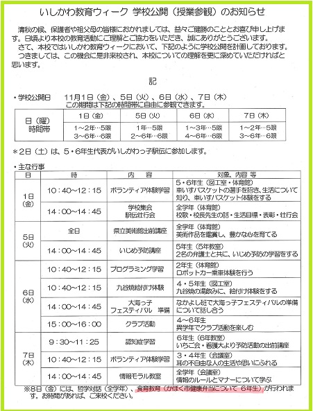 「どこでもミュージアム石川県立美術館がやってきた!今日はこの部屋が美術館」(石川県立美術館出前講座)を全学年で実施しました。本物の美術作品に触れ、感動や驚き等、様々な思いを持って、自分なりに作品を鑑賞することができました。保護者の皆様や地域の皆様方にも参加いただき、ありがとうございました。一年生は、河北郡市の低学年の子どもたちの作品も鑑賞し、芸術の秋を感じる一日になりました。