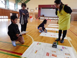 前後左右を示すシールをシートに貼り、その情報をミニコンピュータ(Ichigojam)に入力して、指示通りにロボットを動かしたり、ロボットカーを運転したりしました。