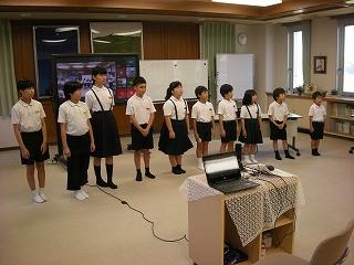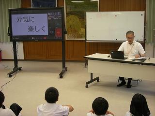 4限目に1学期の終業式を行いました。校歌の後、校長先生のお話、生活目標のふり返りの発表、夏休みの生活、プール利用のきまりについて話を聞き、最後は今月の歌「世界に1つだけの花」を全校のみんなで元気よく歌いました。