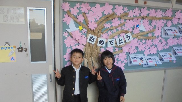 保健室前理桜が一足先に満開になりました。卒業時期に合わせて、掲示を代えている途中だったようです。本物の開花宣言は一週間後らしいですね。早く咲かないかな。