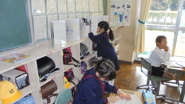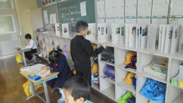 2年生の教室では、学習のまとめとして・・・・が仕上がったようです。見やすいように開いて立ててあります。友だち同士見合っています。早く家に持って帰り、見せてあげたいようです。