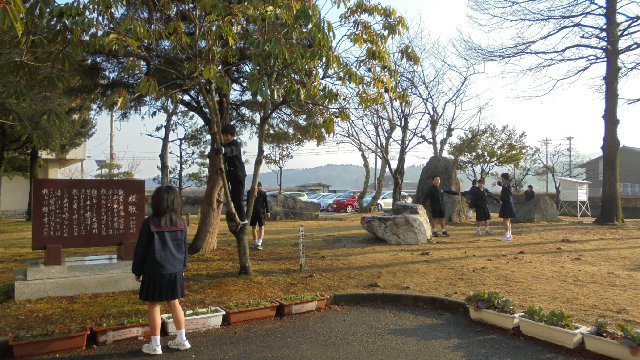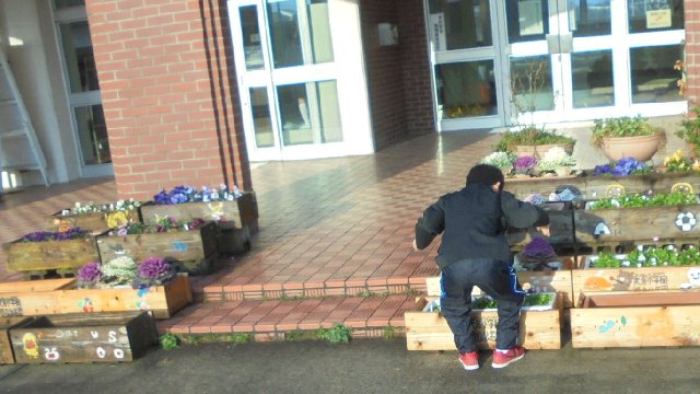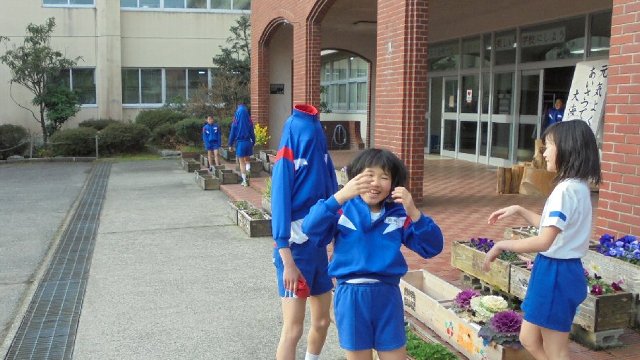 登校するなり外へ遊びに来た子どもたちがプランター運びを手伝ってくれました。中田さんありがとう。そのあとは、仲良く遊んでいます。おやっ、木に登ってだいじょうぶかい。