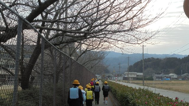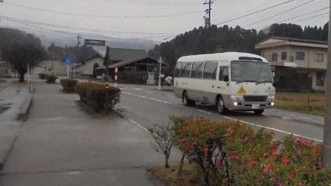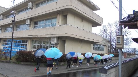春雨じゃ、ぬれていこう。傘をささずに登校する猛者もいました。風邪をひかないでね。スクールバスは全天候対応でうらやましいですね。バスの後ろに夏栗地区の子ども達が小さく写っています。傘の模様でうちの子か分かりますか。