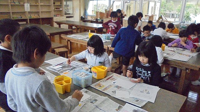先日、3年生が社会科の学習で海っこランドを見学させていただきました。その折、貝殻アート出前授業の話がまとまり、今週実施しました。真っ白なホタテ貝に思い思いの絵を描き入れました。仕上がった作品はアート、すばらしいできばえでした。
