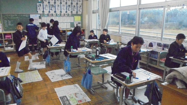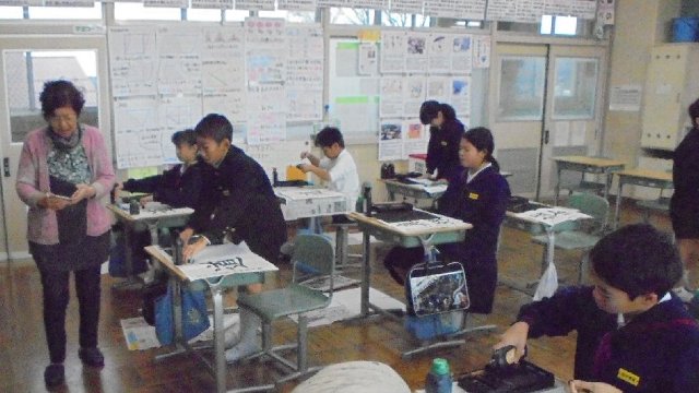 習字の時間、市の西田哲学館が募集している毛筆作品を書いています。指導して下さるのはいつもの城村先生です。城村先生は今回のコンクールのお手本を書いた先生です。お手本を書いた先生に直接習えるなんてラッキー。おかげで上手に書けたよね。