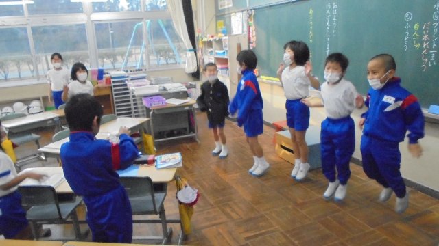 1年生です。今月の歌は、いつもふりつけありです。全身で楽しく歌って1日をスタートしています。北風の歌だけど温かくなっています(笑)
