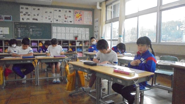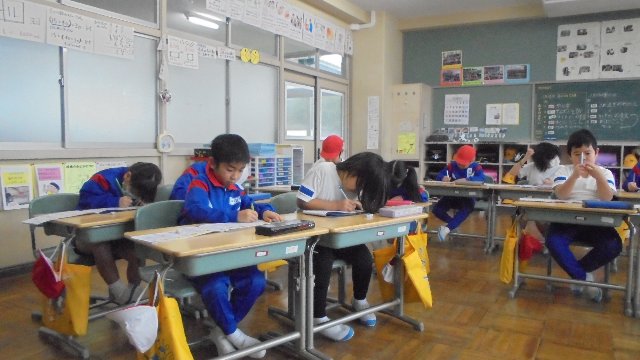 国語の時間です。漢字のドリル練習をしっかりやっています。練習した漢字は10文字、「算」・「父」・「母」・「黒」・「茶」「計」「午」などなど。家に帰ったら書けるか聞いてみて下さい。あと3文字何だったか聞いてみて下さい。午と牛はどうやって見分けるか聞いてみて下さい。
