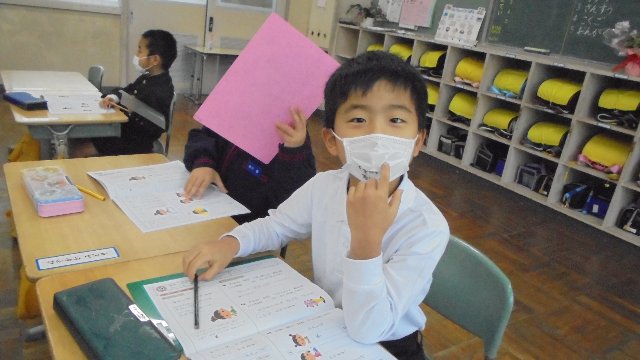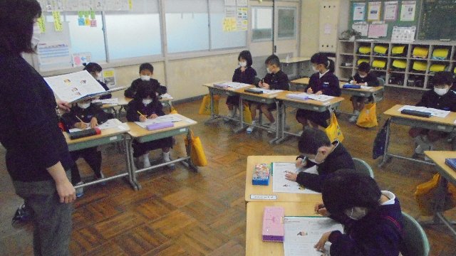 低学年はそろってマスク着用です。マスクするとどんないいことがあるかたずねると、くちびるが乾かないという意見もありました。インフルエンザウィルスは乾燥が大好き、そういった意味からも効き目がありそうですね。お家でもすると良いね。