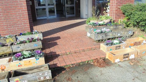 雪が降る前にと思い、子ども達が登校している学期中にいくつかのプランターを玄関にセットしました。葉ボタンがとてもきれいです。他のものは休業中で子どもたちが休みなのであわてません。十分日の当たるところでぎりぎりまで育てます。アドバイザーの助言通り。