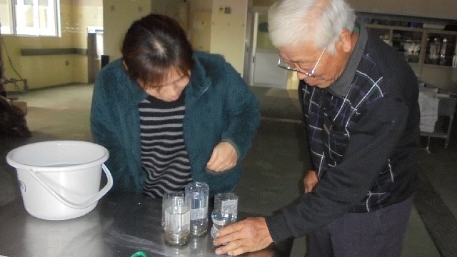 次の日竹多大海川漁協組合長が見に来て下さいました。順調に育っている様子に喜んで下さいました。餌付けについて相談・お願いしました。