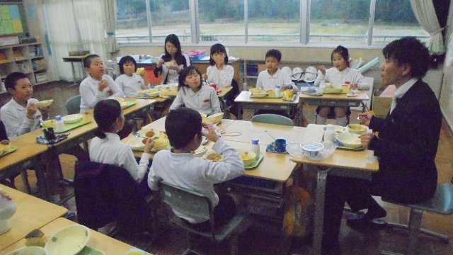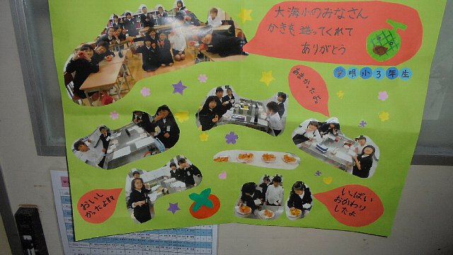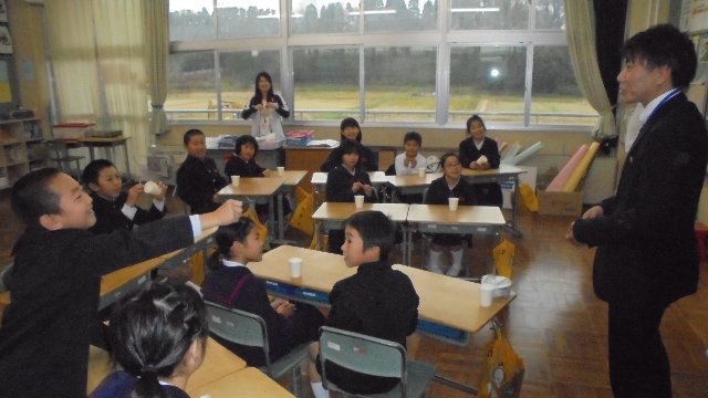 去年本校に勤務し、3年生を担任して下さった竹野先生が大海小学校においでました。現在の4年生のたっての希望で実現しました。その目的はこの子たちが竹野先生と1年がかりで作り上げた味噌が完成したからです。どうしても手渡したい、一緒に完成を喜びたいと言うことでした。