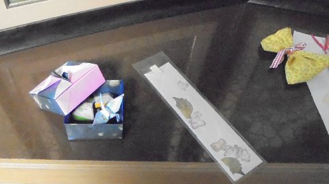 先日紹介した地域の皆さんからのお返し?プレゼントの続きです。折り紙の小物、押し花をあしらった箸ケース、どれも温かい心のこもった贈り物です。