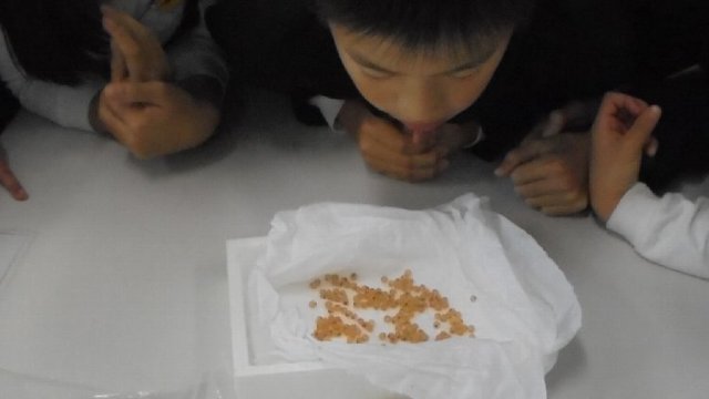水なしでガーゼにくるまれて運ばれてきたのに驚いています。このあと一人ひとりがペットボトルを使って3粒ずつ大切に育てます。