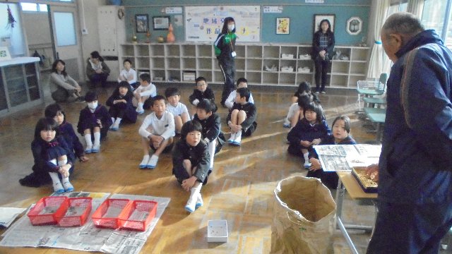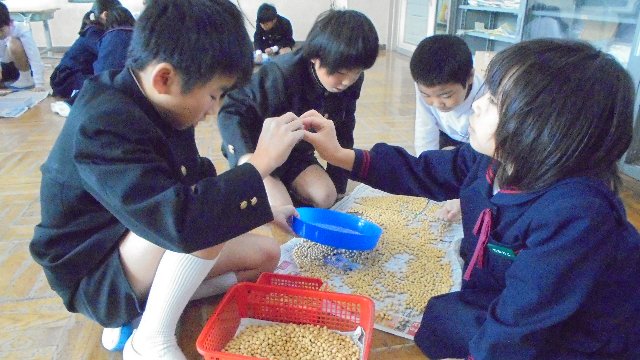 2018年12月12日 12時02分 大豆が乾燥し、味噌作り名人の髙崎さんから次のミッションが子ども達に与えられました。それは大豆の選別です。今年は夏の異常気象で味噌づくりに向かない大豆がいっぱい混じってしまいました。それを一粒一粒より分けます。たいへんですががんばろう。