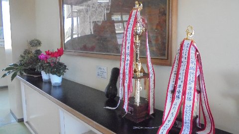 先日まで飾ってあったドッジボール大会のトロフィーが綱引き大会のものに代わりました。大海っ子、校外でもがんばってるね。今朝の新聞になかったので明日の記事にご注目。