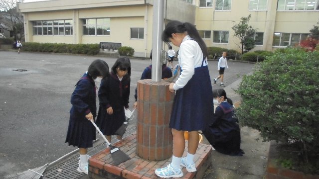 旗掲揚のポールに巻き付いたツルの種取りをしました。高いところからどうやって・・・何のことはない、かんたんなことでした。下からツルを引っ張れば良いのです。まわりに種がたくさん散らばりました。それをていねいにほうきで集めました。ありがとう。