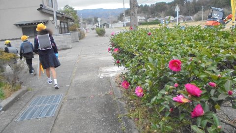 今年も通学路の街路樹の山茶花(さざんか)が花を付け始めました。今朝も強風から子ども達を守ってくれる防風の働きをしてくれていました。前庭にはつばき、廊下には以前紹介したサボテンが咲いています。あのときに比べるとずいぶん花が増えました