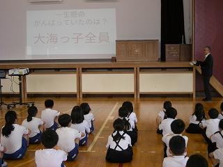 小規模校の大海小学校のよさ、クラスの少人数のよさについて、自分の気持ちを素直に表現していました。多くの人たちが見ている前で話すのは緊張したと思いますが、これまでの練習の成果を十分に発揮し、堂々と立派に発表できました。とてもよい経験ができました。よく頑張りました!