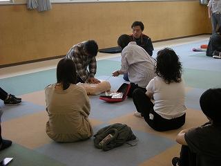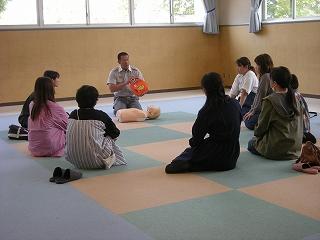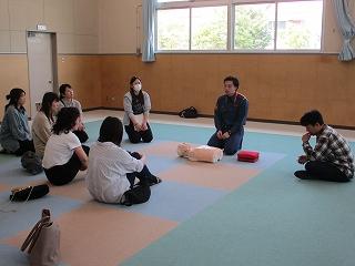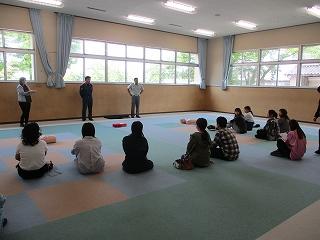 まず、夏休みプール開放のためにPTA救命講習会をプレールームで行いました。保護者を対象にかほく市消防署職員の方からご指導していただきました。