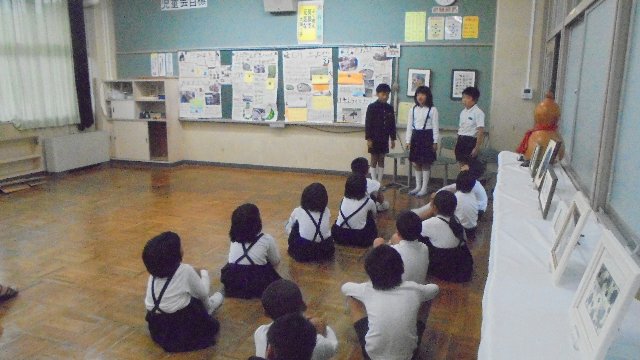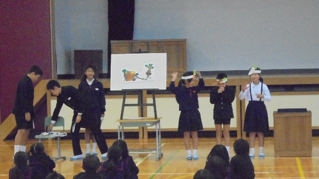 全校集会の後は、後期児童会役員の任命式でした。良い学校、楽しい学校づくりのため高学年ががんばってくれます。発表では、4年生がペットボトルキャップ回収ボックスを作ってくれたお知らせと図書委員会からのミニシアターでした。とっても充実した二つの発表でした。