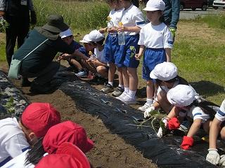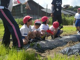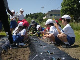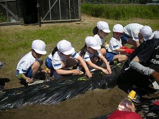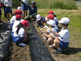 2,3限目に生活科の学習でサツマイモの苗を植えました。学校コーディネーターの池田さんに植え方を教わり、それぞれ苗を植えることができました。これからは植物が元気に成長してくる時期です。植えたサツマイモからたくさん収穫できるよう、しっかりとお世話しましょう。秋の収穫が楽しみですね。