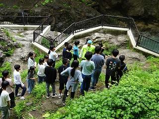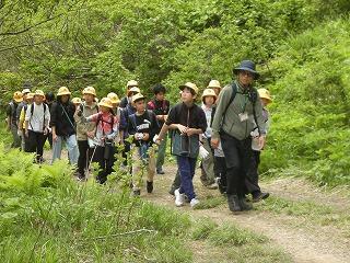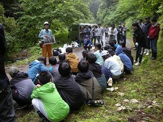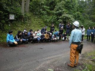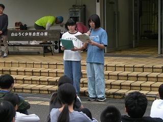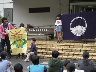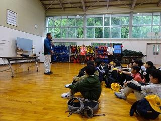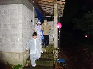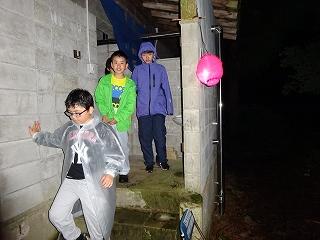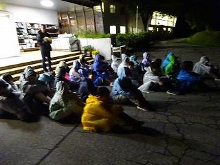 下山後、「つどい」で職員の皆さんにあいさつをしたり、自然の家の説明を聞いたりしました。夕食後の活動は、夜の自然の森の神秘や怖さを実感する「ミステリーゾーン体験」でした。無事ゴールまでたどりつけるよう、仲間と声をかけ合って進みました。進むのをためらう子もいましたが、どの班も無事にゴールに到着できました。