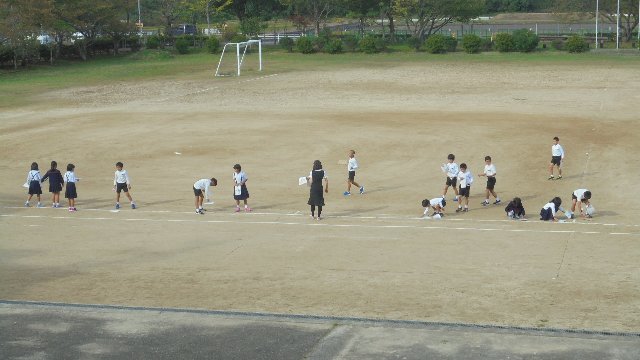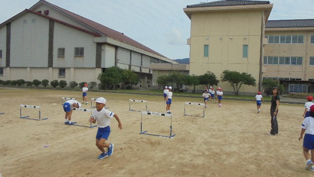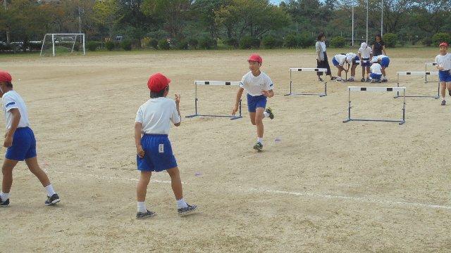 体育で陸上運動の障害走を学習しています。3年生の先生は全日本マスターズ陸上競技選手権大会2000m障害の優勝者、日本記録保持者です。すばらしい先生から教えてもらっていいなぁ。そのこと、わかっているのかな!?(笑)