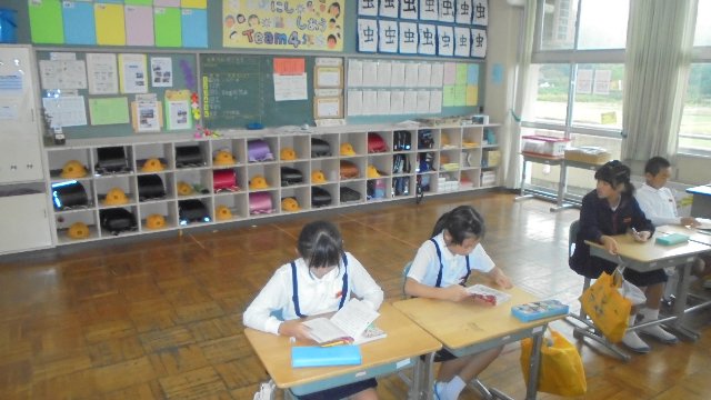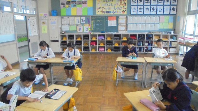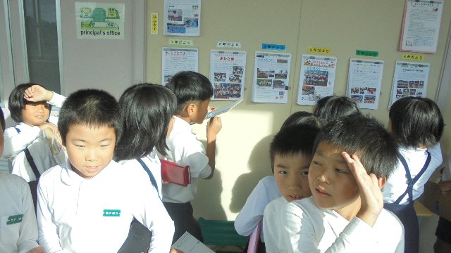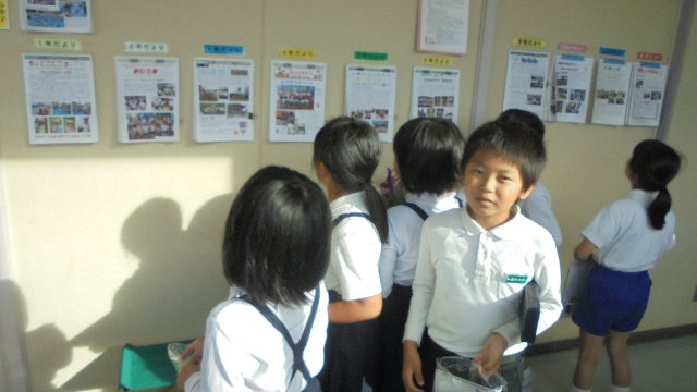 感心します。校長室前に各学年のお便りを掲示してあります。新しいのが出る度ごらんのとおり。廊下なのでまどからさす光がまぶしかったようです。自分の学年のは配ってもらっているから、他の学年のを見ているんですね。小規模校のメリットを生かしてカラーで配布しています。 ホームページからも読めますよ。