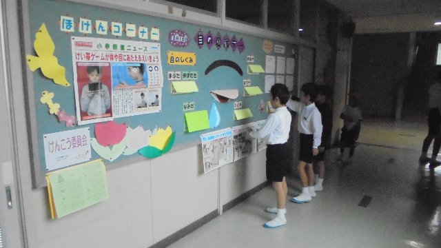 保健室前の掲示です。今月は目の健康について指導しています。お家では、テレビやゲームはだいじょうぶでしょうか。チェック!