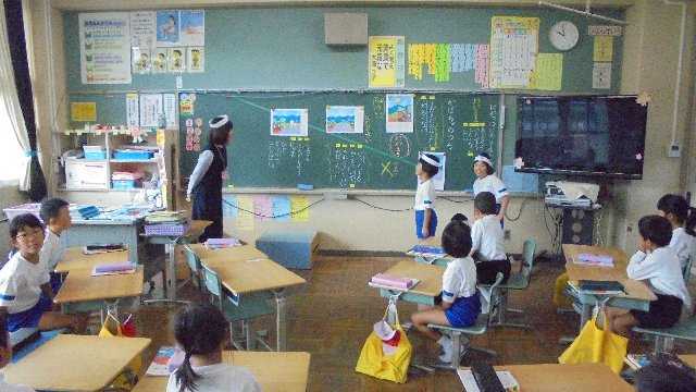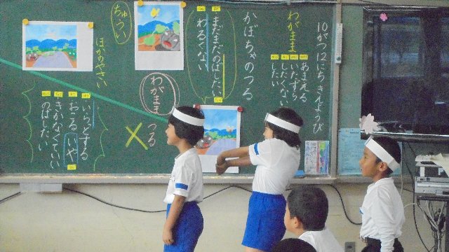 楽しそうに子どもたちが学習をしています。道徳の授業のようです。お面を付けて何かになりきって先生に伝えています。どんな学習だったのでしょうね。