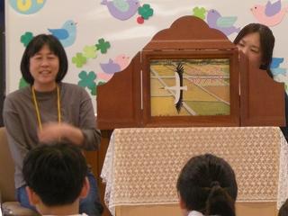 給食後の時間に読み聞かせボランティアグループ「ひみつのポッケ」さんが3,4年生に読み聞かせをしてくださいました。子どもたちは、紙芝居「とんだとんだコウノトリ」のお話を楽しみました。5月は愛鳥週間があったので、お土産に羽ばたく鶴の折り紙をいただきました。鶴の羽のはばたかせ方も教えていただき、みんなでためしてみました。