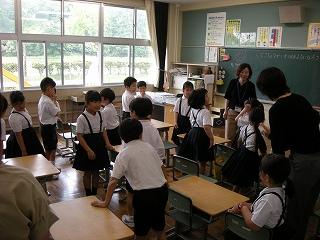 高松中学校のグレース先生にご指導いただき、1限目に外国語活動を楽しみました。今日の課題は「じこしょうかいをできるようになろう」でした。友達どうしで自分の名前を自己紹介し合うことができました。列ごとに自己紹介リレーを行う等、楽しみながら学べました。グレース先生ありがとうございました。