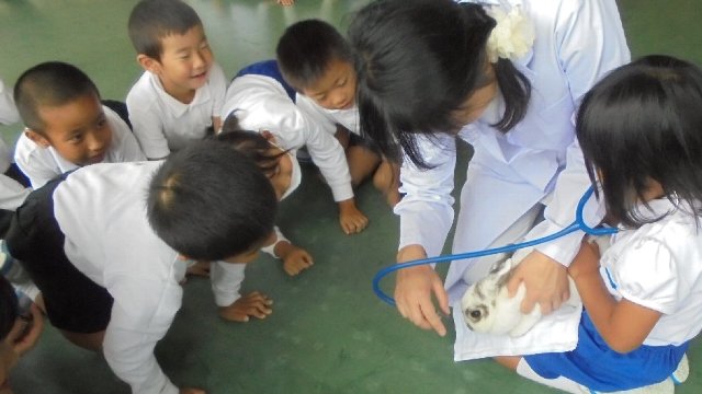学校のウサギがいつもお世話になっている獣医の先生方が学校においでました。あんこときなこ、そして連れてきて下さったウサギ2羽を加え、自分の命、小動物の命について考えました。