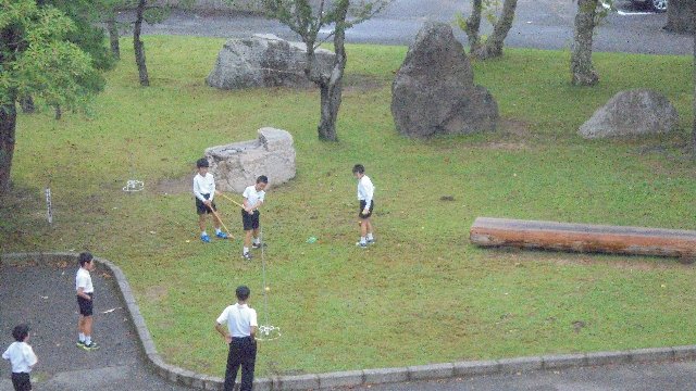 学校全体が仲良く遊べるといいですね。久しぶりにグランドゴルフの道具を出して子どもたちが遊んでいました。
