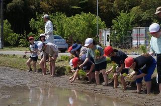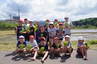 子ども達は足を取られて思うように動けなかったり、泥だらけになったりと悪戦苦闘でしたが、ぬかるみに気を付けながら苗を植えていました。お米を作るには大変な作業があることを、子ども達は体験を通じて実感しているようでした。学校田は学校に近いので、登下校の際などに成長を見守ることができます。稲が元気に育ち、秋に稲刈りをするのが楽しみです