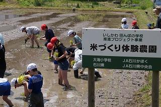 大海小学校では、5年生が毎年「米作り体験」を行っています。気持ちの良い晴天の中、3、4限目に田植えを行いました。
