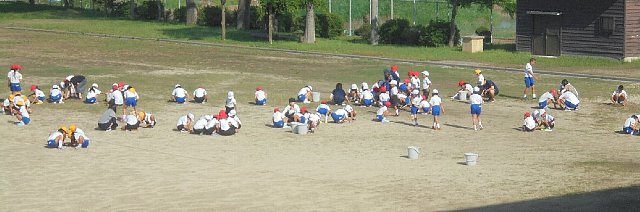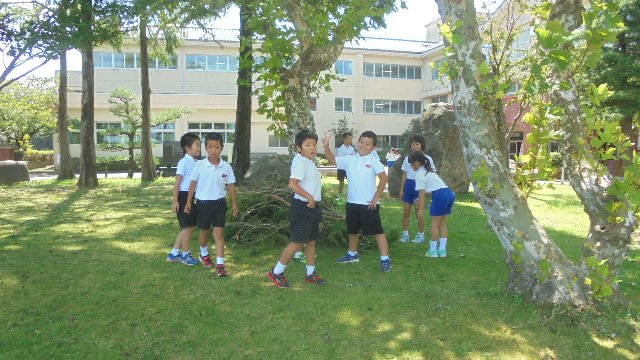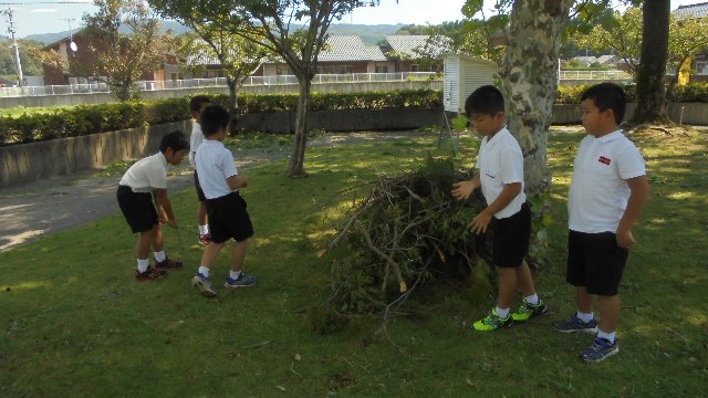台風の風で飛散した木の枝を2年生の子どもたちが集めてくれています。けっこう太い枝も混じっています。学校のため、人のために役立ってくれていますよ。ありがとう。こうしてボランティアの作業を買って出てくれる大海っ子です。