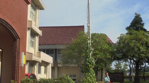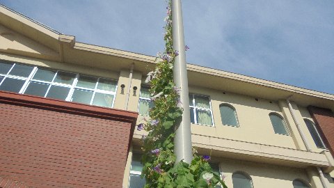 今年のアサガオが玄関の掲揚塔を登り切ったようです。変わり種のアサガオが一番スタミナがありました。4mは優にある高いところでかわいらしい赤い花を咲かせています。小さいのでよく見えないのが残念です。(笑)