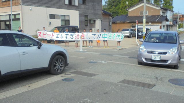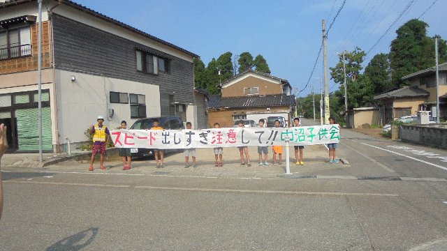 ここは、子ども会で調べた通学路の危険箇所です。のと里山海道看護大インターへ車が急いでいます。子どもたちの発案で横断幕を使ってスピードの出し過ぎを注意して下さるよう、ドライバーに訴えました。