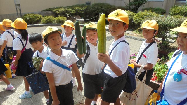 集団下校 手には収穫物