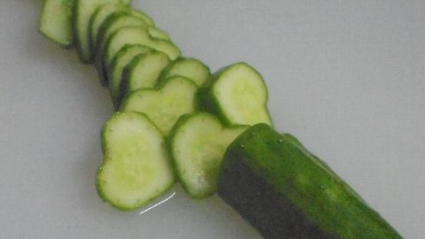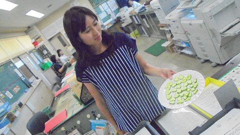 2018年7月10日 17時32分 何の変哲もないキュウリ、ちょっと緑が薄いかな・・・ところが切ってみるとびっくり、切り口がきれいなハートの形。みなさん見たことありますか。インスタ映えしそうですね。実はこのキュウリは児童の祖父が育てた物、どうやって作るんでしょうね。さて、何年生のおなかにおさまったのでしょうか。
