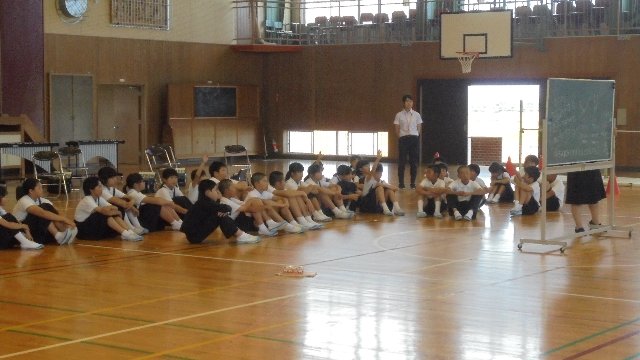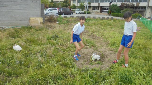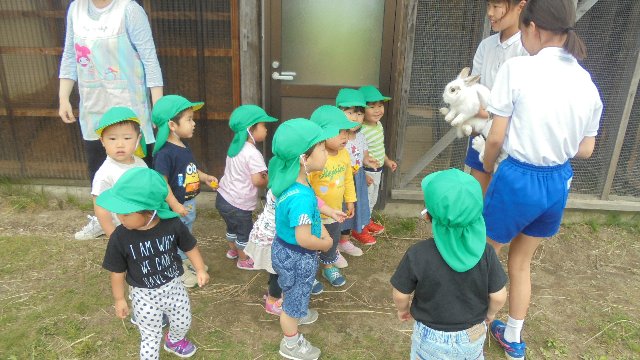 飼育委員、特に6年の出村さんと坂田さんは熱心にウサギの世話をしてくれます。毎朝手にはキャベツやニンジンを持ってウサギ小屋へ。自由にしてあげようと外に出して散歩させてくれています。この日はちょうど保育所の一団が通りかかり、ふれあっていました。いつもありがとう。