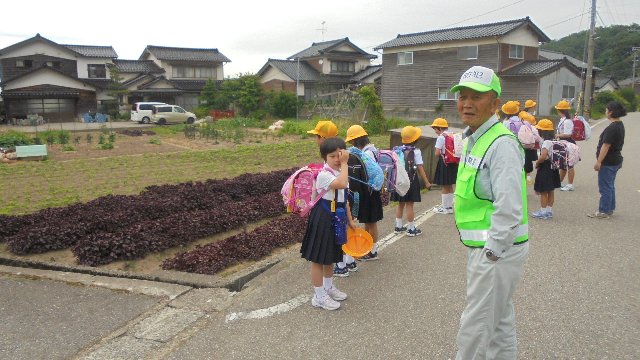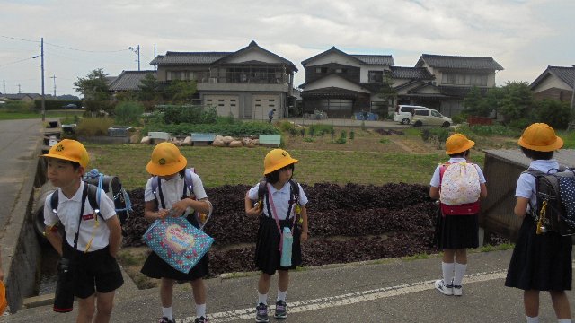 今日も元気にみんな集まってきます。防犯の付き添いは、味噌づくりの髙崎さんです。写真の後ろに大きく育ってきた大豆畑が見えます。