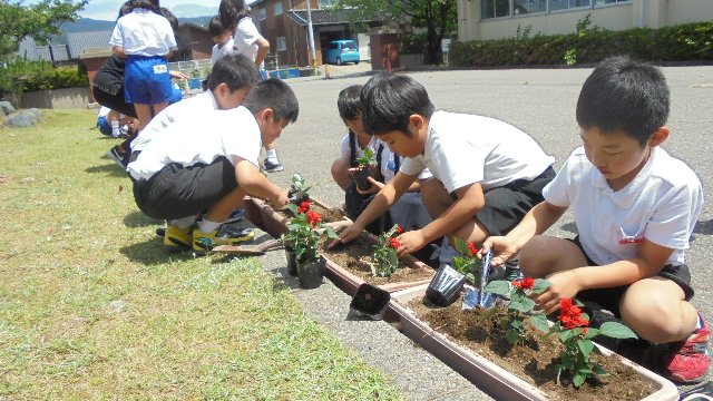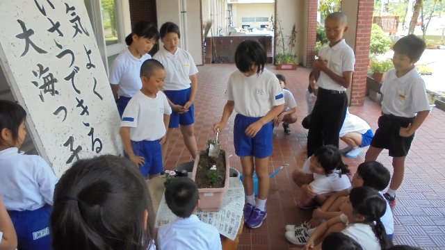 春の花から夏の花へ・・・玄関のプランターの花を植え替えしました。昼休みボランティア活動として取組もした。今回からさわやか委員がお世話してくれました。低学年に教えてあげて、じっさいに植えてもらいました。間隔のバランスや深さが難しかったです。というか・・・この後大きく育ってきれいな花を咲かせてくれるでしょう。