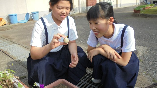 先日は学級園で、今日は玄関前のプランターから写真の大きさの卵が発見されました。両方とも、土の中になかば埋められたようになっていました。鳥の卵のようなのですが・・・土の中に埋める種類っていましたっけ。。最近よく見かけるキジかな?1個目は割ってしまったので今回は軒下で見守ります。わくわく